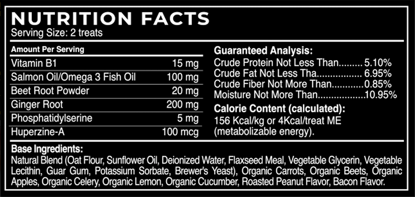Many supplements use synthetic forms of nutrients that the canine body struggles to absorb and utilize. NeuroChew uses fresh nutrients wrapped in an organic, whole-food base that's bioavailable and easily recognized by your dog's digestive body.